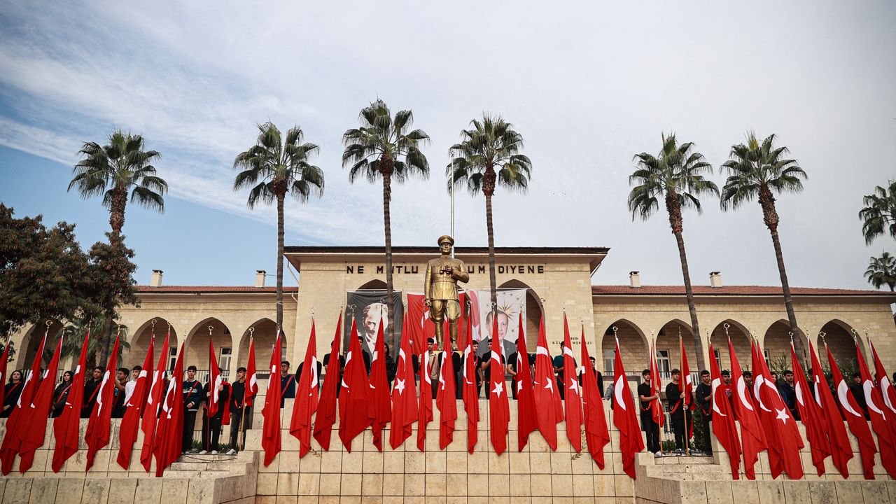 Hatay'da Antakya Cumhuriyet Alanı'nda gerçekleştirilen törende İl Milli Eğitim Müdürü Harun Tüysüz, Atatürk Anıtı'na çelenk sundu.