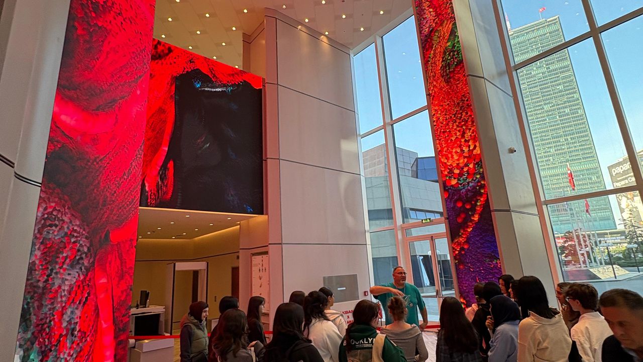 Program kapsamında öğrenciler, rehber eşliğinde Akbank Genel Müdürlük binasında yer alan Refik Anadol'un yapay zeka eserini inceliyor.