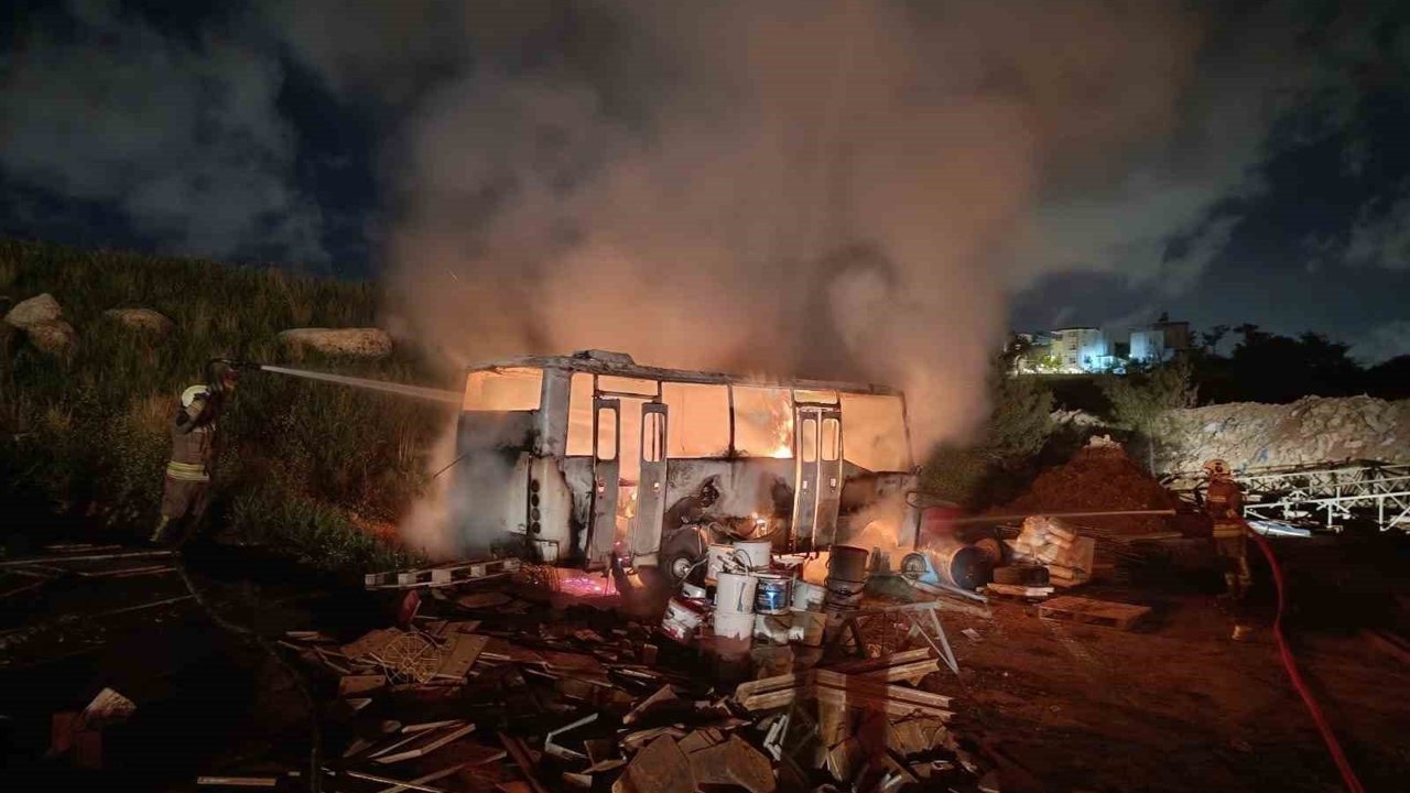 Hatay'da şantiye alanında alevlere teslim olan konteyner ve minibüs yanarak kullanılmaz hale geldi.