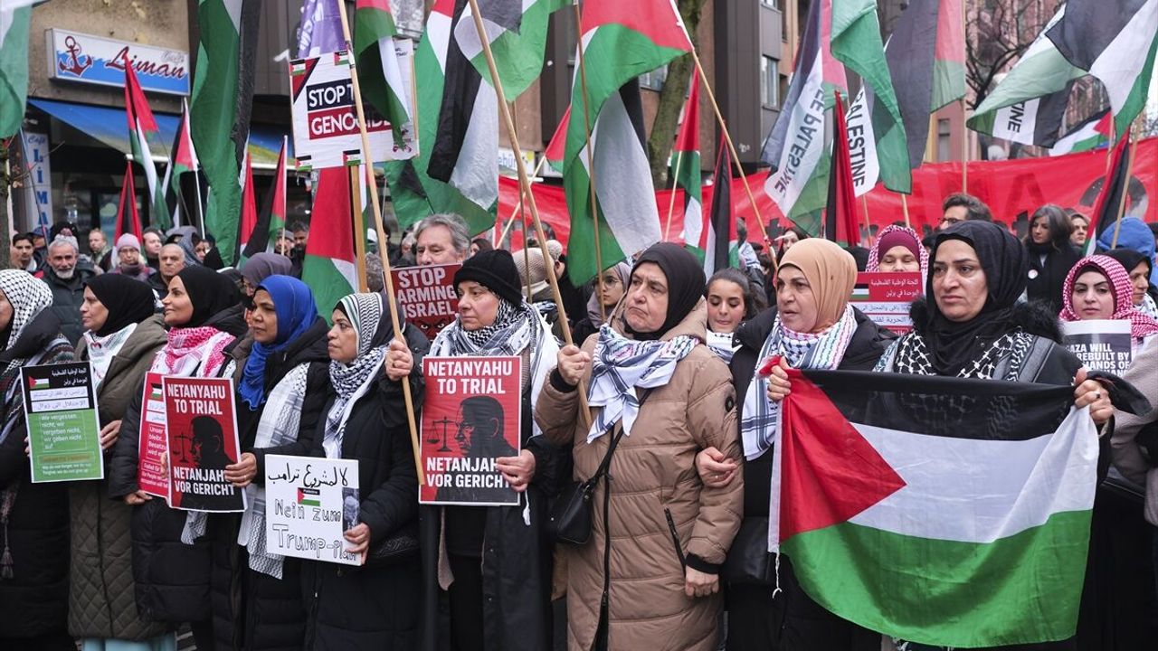 Kreuzberg ilçesindeki Kottbusser Damm Caddesi'nde 'Suç ortaklığını durdurun, yaptırımlar şimdi' çağrısıyla toplanan çok sayıda gösterici daha sonra şehir merkezindeki Leipzig Meydanı'na doğru yürüyüş gerçekleştirdi.