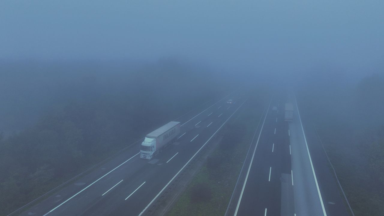 Sis tabakasının kapladığı ova ile sisin etkili olduğu otoyoldaki trafik akışı, havadan görüntülendi.