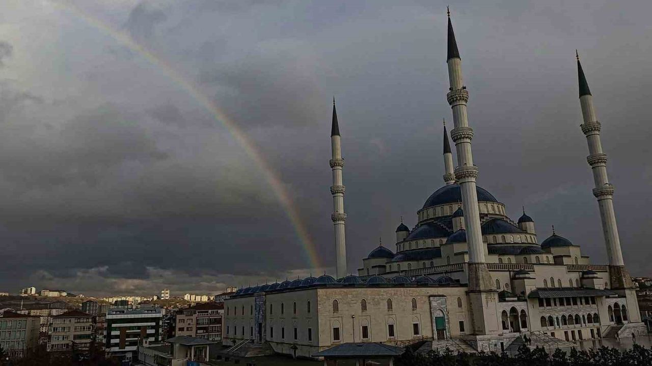 Ankara'nın simgelerinden Kocatepe Camii'nin üzerinde yağmurun ardından gökkuşağı oluştu. Başkent semalarında akşam saatlerinde beliren gökkuşağı, Kocatepe Camii'nin siluetiyle birlikte ortaya masalsı görüntüler çıkardı. Yağış sonrası kısa süreliğine görülen doğa olayı, çevrede bulunan vatandaşların ilgisini çekti.