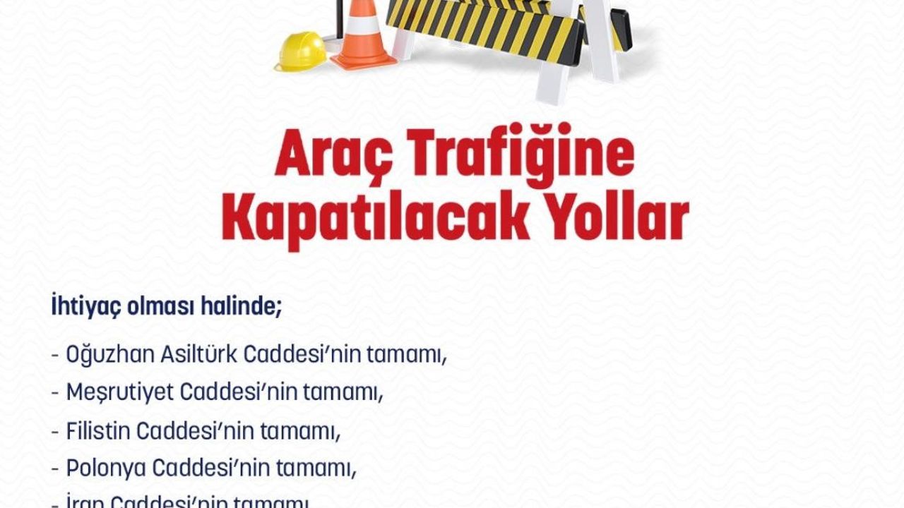 'Yılbaşı kutlamaları ile ilgili olarak 31 Aralık 2025 günü saat 18.00'den itibaren; Atatürk Bulvarı'nın Sıhhiye Orduevi ile Akay Kavşak arasında kalan bölümü, GMK Bulvarı'nın tamamı, Milli Müdafaa Caddesi'nin tamamı, Aşkabat Caddesi'nin (Bahçeli 7.Cadde) tamamı, Bestekar Caddesi'nin tamamı, Kızılırmak Caddesi'nin tamamı, Olgunlar Caddesi'nin tamamı, Selanik Caddesi'nin tamamı, Tunalı Hilmi Caddesi'nin tamamı, Azerbaycan Caddesi'nin (Bahçeli 3.Cadde) tamamı, Yüksel Caddesi'nin tamamı, Sakarya Caddesi'nin tamamı, Kumrular Caddesi'nin tamamı, Tunus Caddesi'nin tamamı, Tuna Caddesi'nin tamamı, Ziya Gökalp Caddesi'nin Kolej Kavsak ile Kızılay Kavsak arasında kalan bölümü, İnkılap Sokağı'nın tamamı, Konur Sokağı'nın tamamı, Karanfil Sokağı'nın tamamı, Bilge Sokağı'nın tamamı, Bülten Sokağı'nın tamamı, Çığır Sokağı'nın tamamı, Bayındır Sokağı'nın tamamı, ihtiyaç olması halinde; Oğuzhan Asiltürk Caddesi'nin tamamı, Meşrutiyet Caddesi'nin tamamı, Filistin Caddesi'nin tamamı, Polonya Caddesi'nin tamamı, İran Caddesi'nin tamamı, Arjantin Caddesi'nin tamamı, Kuleli Caddesi'nin tamamı programlar sona erene kadar trafiğe kapatılacaktır. Kamuoyuna saygıyla duyurulur.'