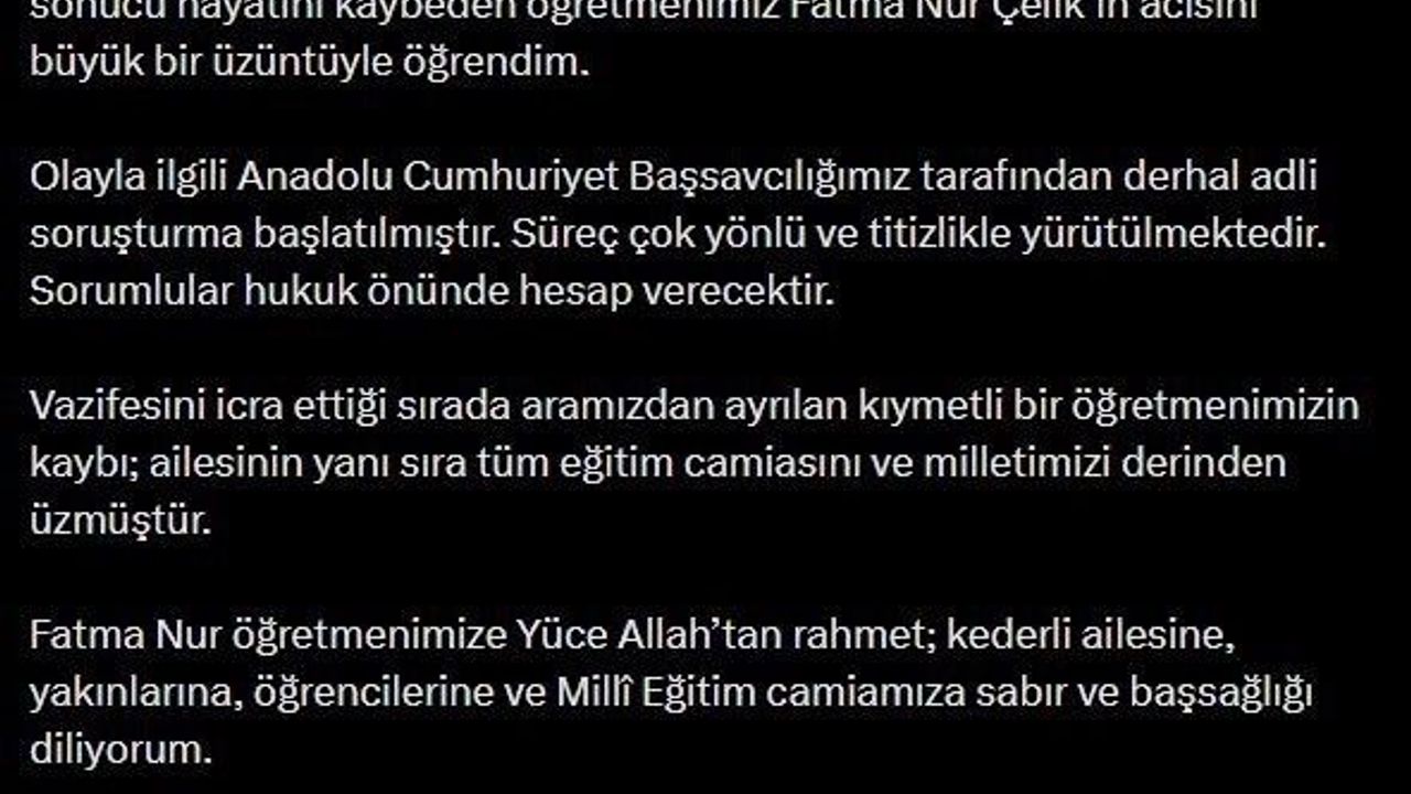 Adalet Bakanı Akın Gürlek, Öğretmen Fatma Nur Çelik'in öldürülmesine ilişkin, 'Olayla ilgili Anadolu Cumhuriyet Başsavcılığımız tarafından derhal adli soruşturma başlatılmıştır. Süreç çok yönlü ve titizlikle yürütülmektedir' dedi.