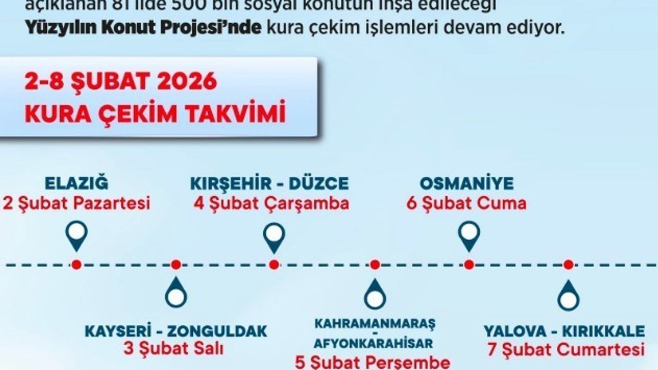 2-8 Şubat haftası takvimine göre; 2 Şubat Pazartesi Elazığ'da 3 bin 825, 3 Şubat Salı Kayseri'de 7 bin 562, Zonguldak'ta bin 872, 4 Şubat Çarşamba Kırşehir'de bin 633, Düzce'de 2 bin 470, 5 Şubat Perşembe Kahramanmaraş'ta 8 bin 195, Afyonkarahisar'da 4 bin 370, 6 Şubat Cuma Osmaniye'de 2 bin 990, 7 Şubat Cumartesi Yalova'da bin 805, Kırıkkale'de bin 736 konut için kura çekimi yapılacak. Böylece 2-8 Şubat haftasında toplam 36 bin 458 sosyal konutun daha hak sahipleri belirlenecek.
