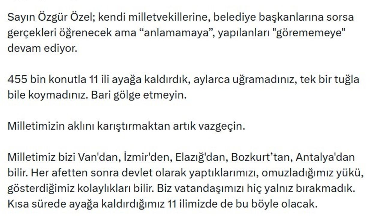 'Sayın Özgür Özel; kendi milletvekillerine, belediye başkanlarına sorsa gerçekleri öğrenecek ama anlamamaya, yapılanları görememeye devam ediyor. 455 bin konutla 11 ili ayağa kaldırdık, aylarca uğramadınız, tek bir tuğla bile koymadınız, bari gölge etmeyin. Milletimizin aklını karıştırmaktan artık vazgeçin. Milletimiz bizi Van'dan, İzmir'den, Elazığ'dan, Bozkurt'tan, Antalya'dan bilir. Her afetten sonra devlet olarak yaptıklarımızı, omuzladığımız yükü, gösterdiğimiz kolaylıkları bilir. Biz vatandaşımızı hiç yalnız bırakmadık. Kısa sürede ayağa kaldırdığımız 11 ilimizde de bu böyle olacak.'