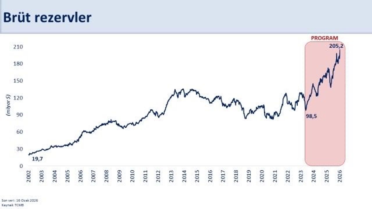 'Rezervlerimiz tarihi zirvesinde. Uyguladığımız program sayesinde brüt rezervler yaklaşık 107 milyar dolar artarak 205,2 milyar dolara ulaştı. Swap hariç net rezervlerdeki artış ise 139,3 milyar dolar oldu. Uluslararası standartlara göre rezerv yeterliliğini sağladık. Aynı zamanda, önemli bir şartlı yükümlülük olan 143 milyar dolar tutarındaki KKM'den çıkış sürecini de başarıyla tamamlıyoruz. Böylece döviz pozisyonunda toplam 280 milyar doları aşan iyileşme gerçekleşti. Güçlenen makro finansal istikrar, risk primimizin azalmasına ve ekonomimizin şoklara karşı daha dayanıklı hale gelmesine önemli katkı sağlıyor.'