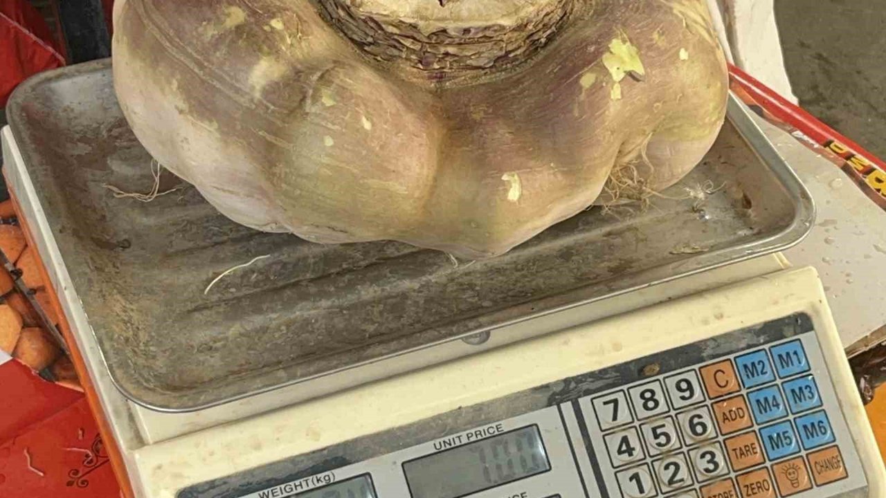 Batman'da pazar tezgahında sergilenen yaklaşık 4 kilogram ağırlığındaki dev turp görenleri şaşırttı. Normal şartlarda 100 ila 200 gram arasında değişen turpların aksine bu sıra dışı büyüklük, pazara gelenlerin hem dikkatini çekti hem de merak uyandırdı.