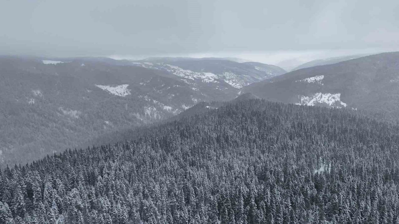 Çankırı-Kastamonu sınırındaki Ilgaz Dağı, kar yağışıyla beyaz örtüyle kaplandı. Ortaya çıkan kartpostallık manzara havadan görüntülendi.