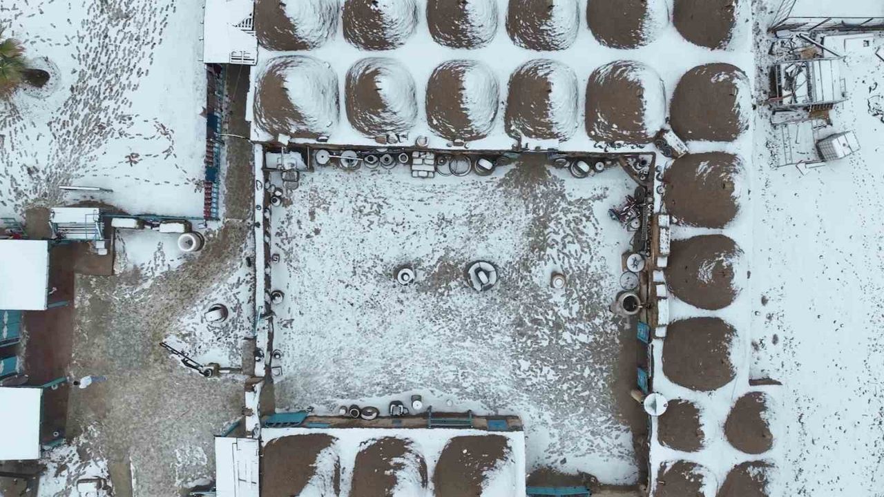 Şanlıurfa'nın tarihi ve turistik ilçesi Harran'da havadan görüntülenen kar görüntüleri eşsiz manzaralar oluşturdu.