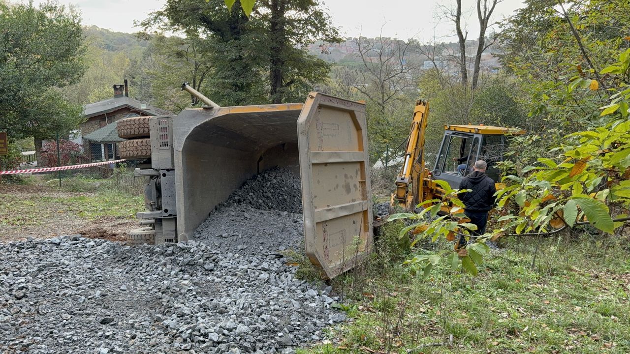 Akbaba Mahallesi Kaymakdonduran mevkisinde toprak yolda ilerleyen M.Ç. idaresindeki 34 DDF 966 plakalı mıcır yüklü kamyon devrildi.