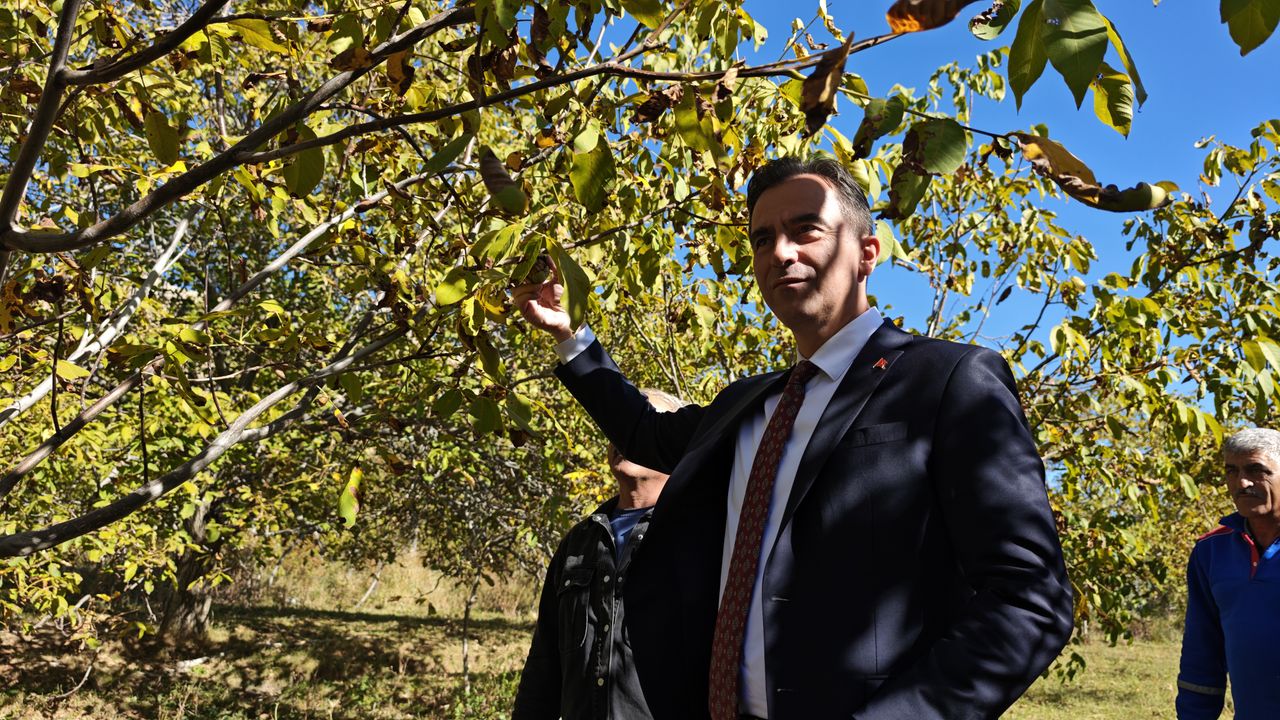 Karakaya, protokol üyeleri ile ceviz üreticisi Mehmet Akkoyun'a ait bahçeyi ziyaret etti.