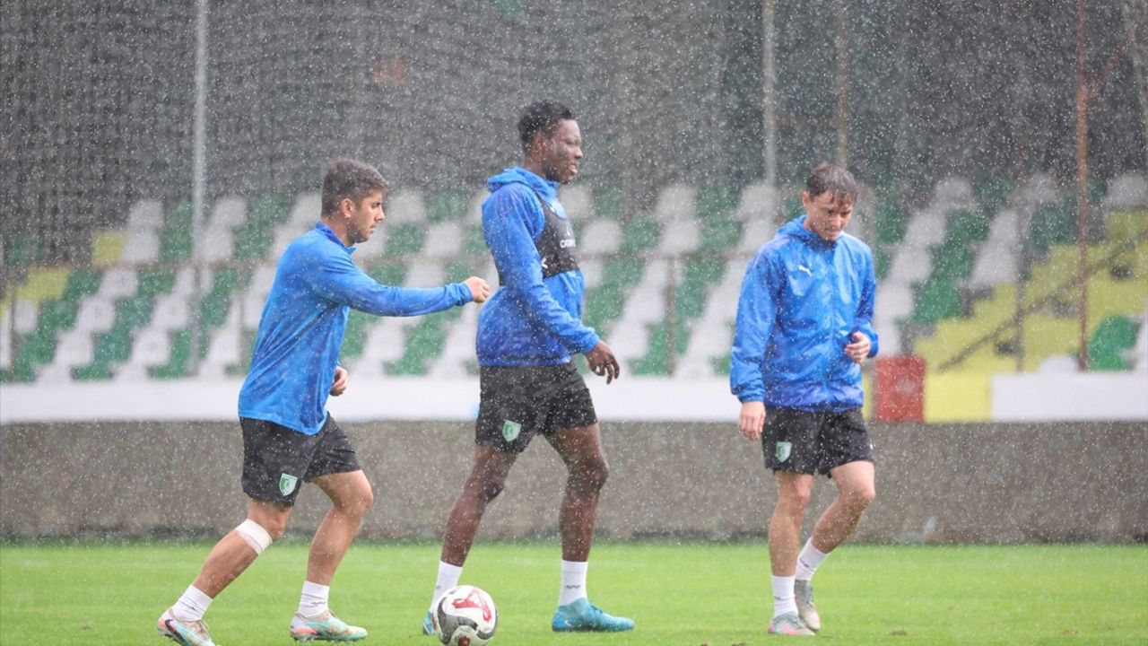 Oyuncuların sağanak altında pas ve top kapma çalışması yaptığı idman, yarı sahada oynanan maçla tamamlandı.