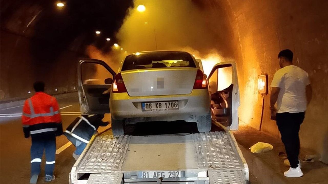TEM Otoyolu'nun Bolu Dağı Tüneli geçişinde kaput kısmından dumanlar yükselen oto kurtarıcı alevlere teslim oldu.
