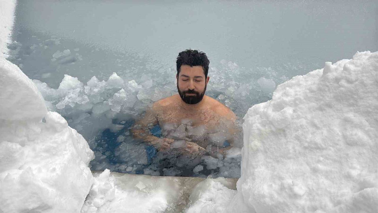 Bolu'da yılbaşı tatili için kente gelen Eren Biri, hava sıcaklığının eksi 10 dereceye kadar düştüğü Bolu Dağı'nda soğuk suya girdi.