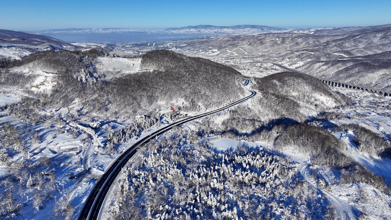 DÜZCE (AA) - Türkiye'nin önemli kara yolu geçiş noktalarından Bolu Dağı'nda kar yağışının ardından oluşan kış manzaraları dronla kayda alındı.