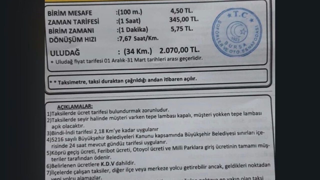 Öte yandan, Uludağ'a ulaşım için belirlenen taksi ücreti 2 bin 70 TL olarak açıklandı. Uludağ fiyat tarifesinin 1 Aralık ile 31 Mart tarihleri arasında geçerli olduğu bildirildi.