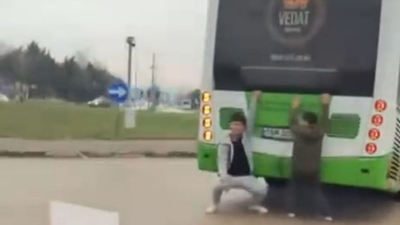 Seyir halindeki otobüsün arka bölümüne tutunarak ayaklarını yere süre çocuklar, uzun süre bu şekilde yolculuk yaptı. Tehlikeli anlar, çevredeki bir vatandaşın cep telefonu kamerasına saniye saniye yansıdı.