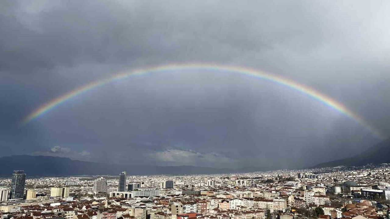 Bursa'da etkili olan yağışın ardından ortaya çıkan gökkuşağı görsel şölen oluşturdu.