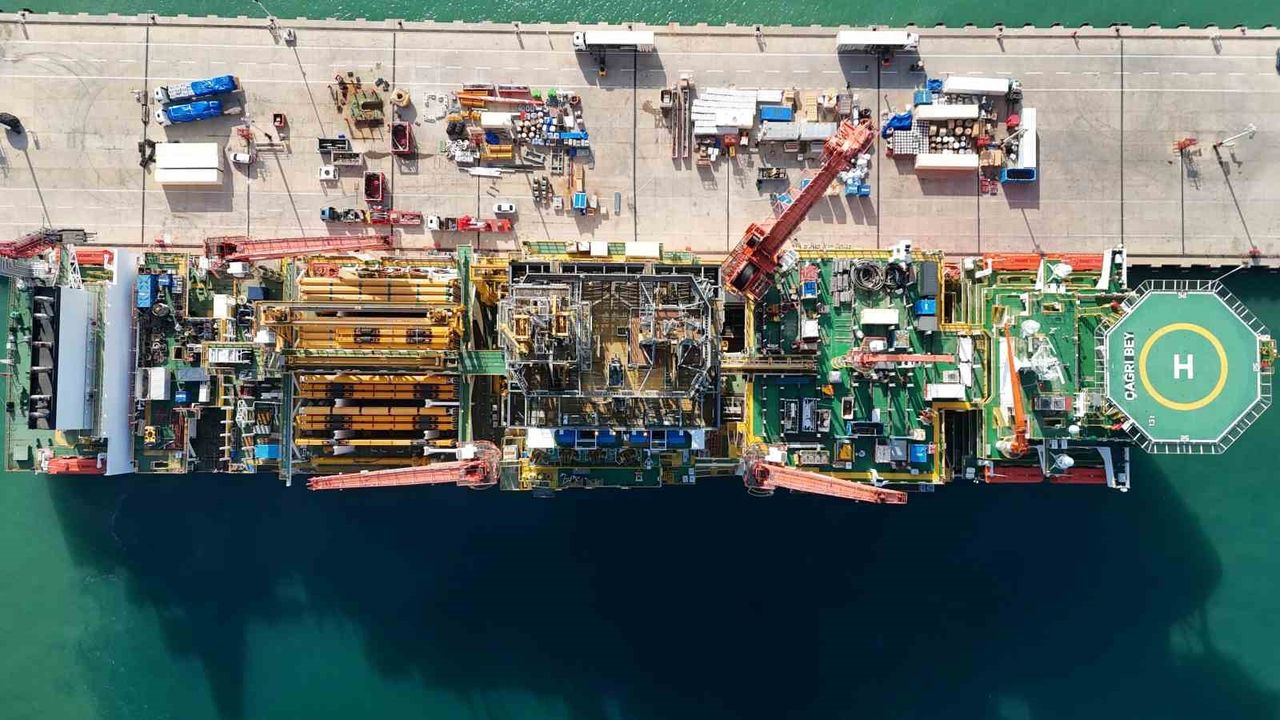 Türkiye'nin enerji filosunun yeni gemilerinden Çağrı Bey Derin Deniz Sondaj Gemisi, bugün Taşucu Limanı'ndan düzenlenen törenle Somali'ye uğurlanacak. Tören öncesi gemi dronla görüntülendi.