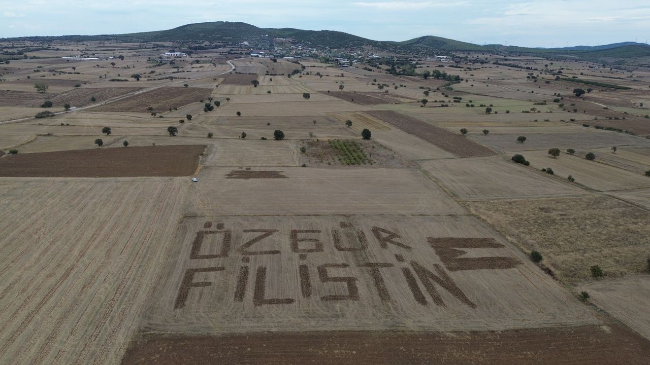 Eskibalıklı köyünde tarım ve hayvancılıkla uğraşan Hüseyin Savaş, AA muhabirine 13 dönümlük tarlasına traktörle 'Özgür Filistin' yazdığını söyledi.