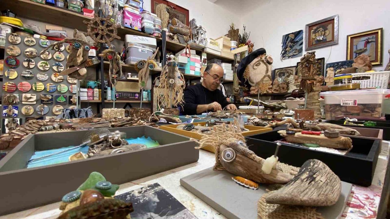 İzmir'in Çeşme ilçesinde 33 yıl esnaflık yapan 64 yaşındaki Nihat Atagöz, deniz kıyısından topladığı odun, taş ve metal parçalarını sanata dönüştürüyor. Karikatür, heykel ve mozaiği birleştiren Atagöz'ün eserleri, dünyanın dört bir yanına ulaşıyor.