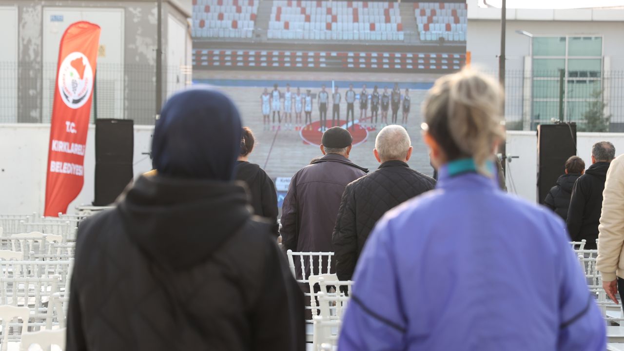 Kırklareli Belediyesi Fen Bilimleri Kadın Basketbol Takımı'nın seyircisiz oynama cezası nedeniyle Seçil Kauçuk Mersin Basketbol ile oynanan maç için Yeni Kırklareli Spor Salonu'nun bulunduğu alana dev ekran kuruldu.