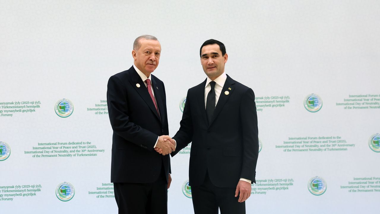 Ev sahibi Türkmenistan Cumhurbaşkanı Serdar Berdimuhamedov tarafından karşılanan Cumhurbaşkanı Erdoğan, Berdimuhamedov ile tokalaşarak fotoğraf çektirdi.