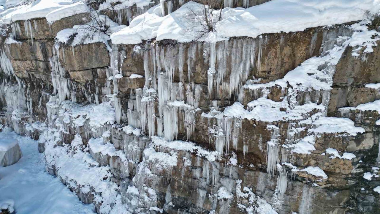 Şırnak'ta çetin geçen kışla birlikte dağlarda buzdan şelaleler oluştu. Dev sarkıtların oluştuğu bölgelerde her yer buz pistine döndü.