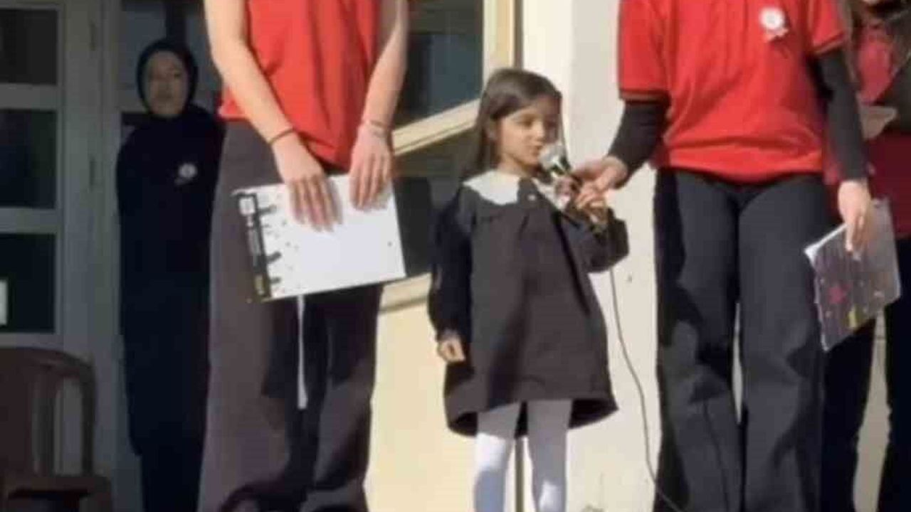 Diyarbakır'ın Çermik ilçesinde Kız Mesleki ve Teknik Anadolu Lisesi'ndeki etkinliğe katılan 4 yaşındaki ana sınıfı öğrencisi Beste Duru Yıldız, İstiklal Marşı'nın kabulü yıl dönümünde ilk dört kıtasını ezbere okudu.