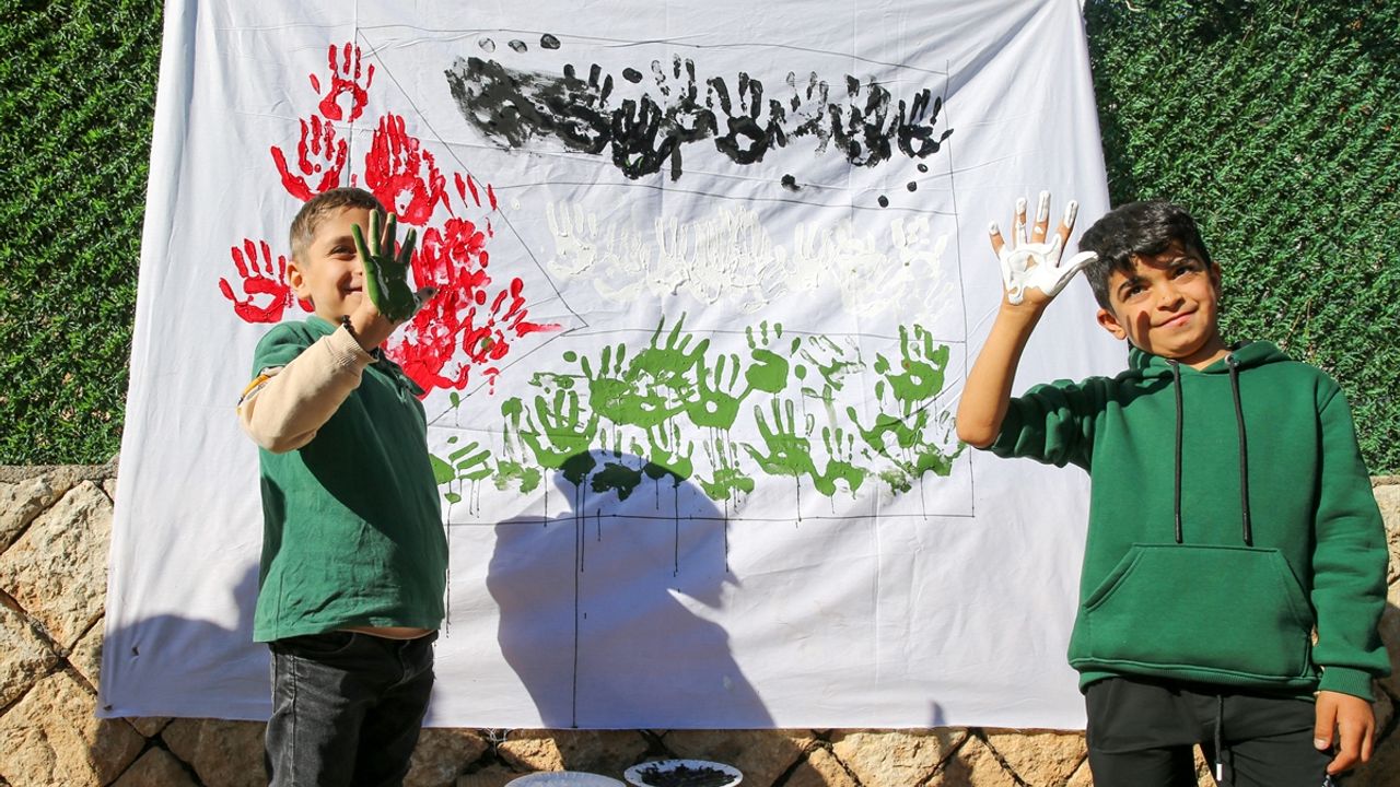 Etkinliğe katılan öğrenciler, kırmızı, siyah ve yeşile boyadıkları parmaklarını ve ellerini kumaştan oluşturulan panoya basarak Filistin bayrağını simgeleyen bir çalışma ortaya çıkardı.
