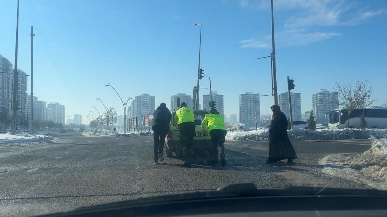 Diyarbakır'ın merkez Kayapınar ilçesinde trafik polisleri, otomobili çalışmaya sürücüye yardımcı olduğu anlar cep telefonu kamerasına yansıdı.