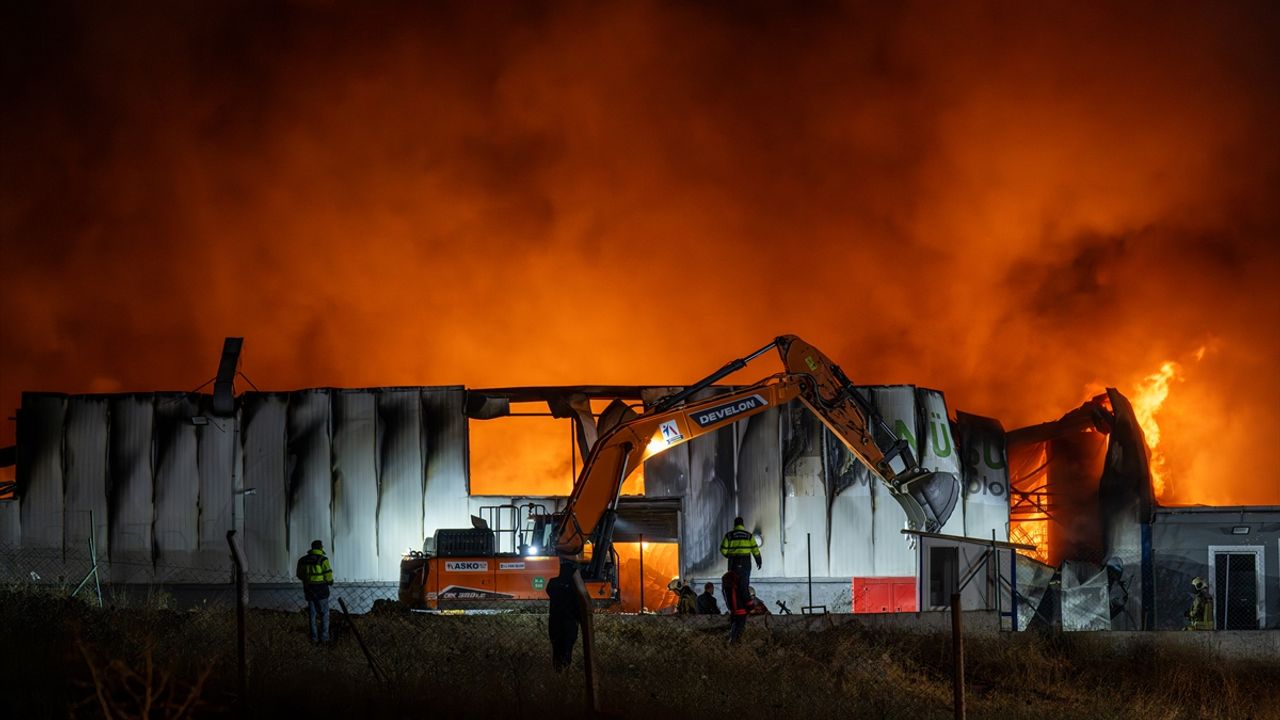 Elmadağ'da Hasanoğlan Organize Sanayi Bölgesi'nde gece saatlerinde, geri dönüşüm fabrikasında henüz belirlenemeyen nedenle yangın çıktı.