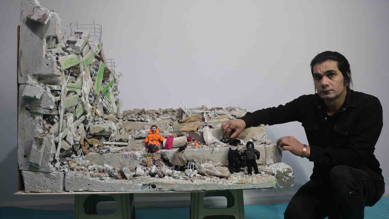 Hatay'da asrın felaketinde kız kardeşini kaybeden ve iki çocuk babası olan 47 yaşındaki Mehmet Kocaman, Kahramanmaraş'ta depremde enkaz altında kalan evladının elinden tutan ve bir an kızının elini bırakmayan Mesut Hançer'den etkilenerek 3 ay süren çalışmayla deprem minyatürü yaptı.
