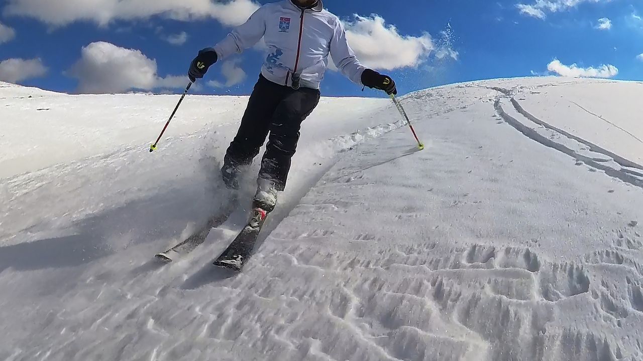 Kayak antrenörü Canser Atila, beraberindeki bir arkadaşıyla bir süre önce etkili olan kar yağışıyla zirvesi beyaza bürünen dağda sezonun ilk kayağını yapmak için etkinlik düzenledi.