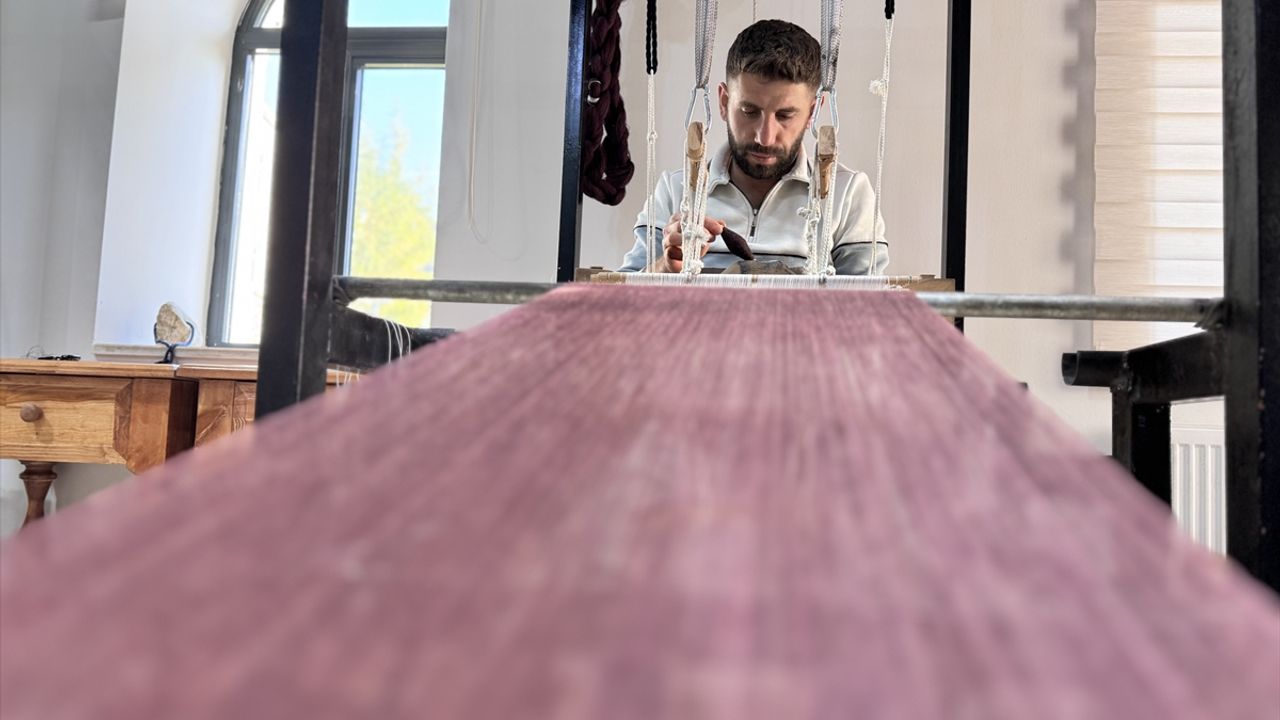 Şal Şepik Dokuma Atölyesi'nde çalışan 6 erkek usta, saf tiftikten hazırlanan iplikleri kök boyayla renklendirdikten sonra tezgahlarda elle dokuyarak kumaş haline getiriyor.