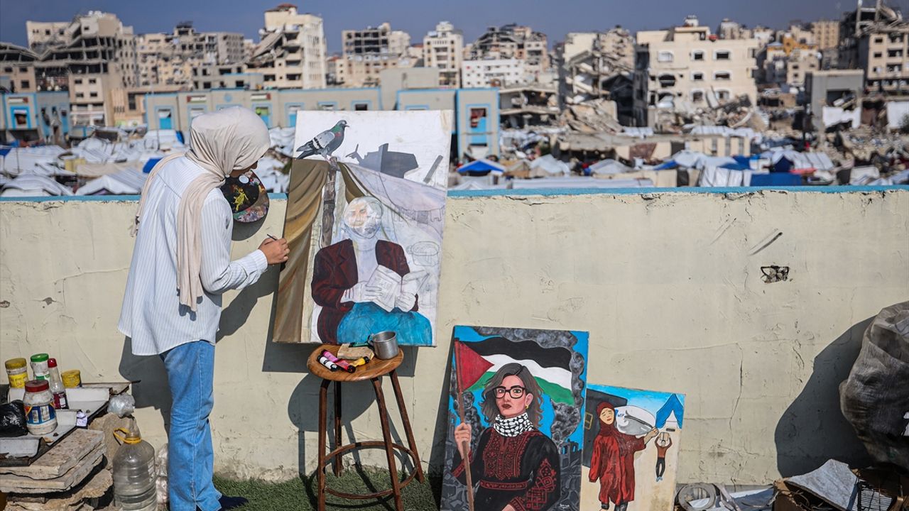 Resimlerde Gazze'de yaşadıkları durumdan ilham aldığını aktaran Sara, 'Artık bütün resimlerim yıkımdan, kandan ve şehitlerden ibaret bir hal aldı. Bütün resimlerim acı bir gerçeği yansıtır oldu.' dedi.