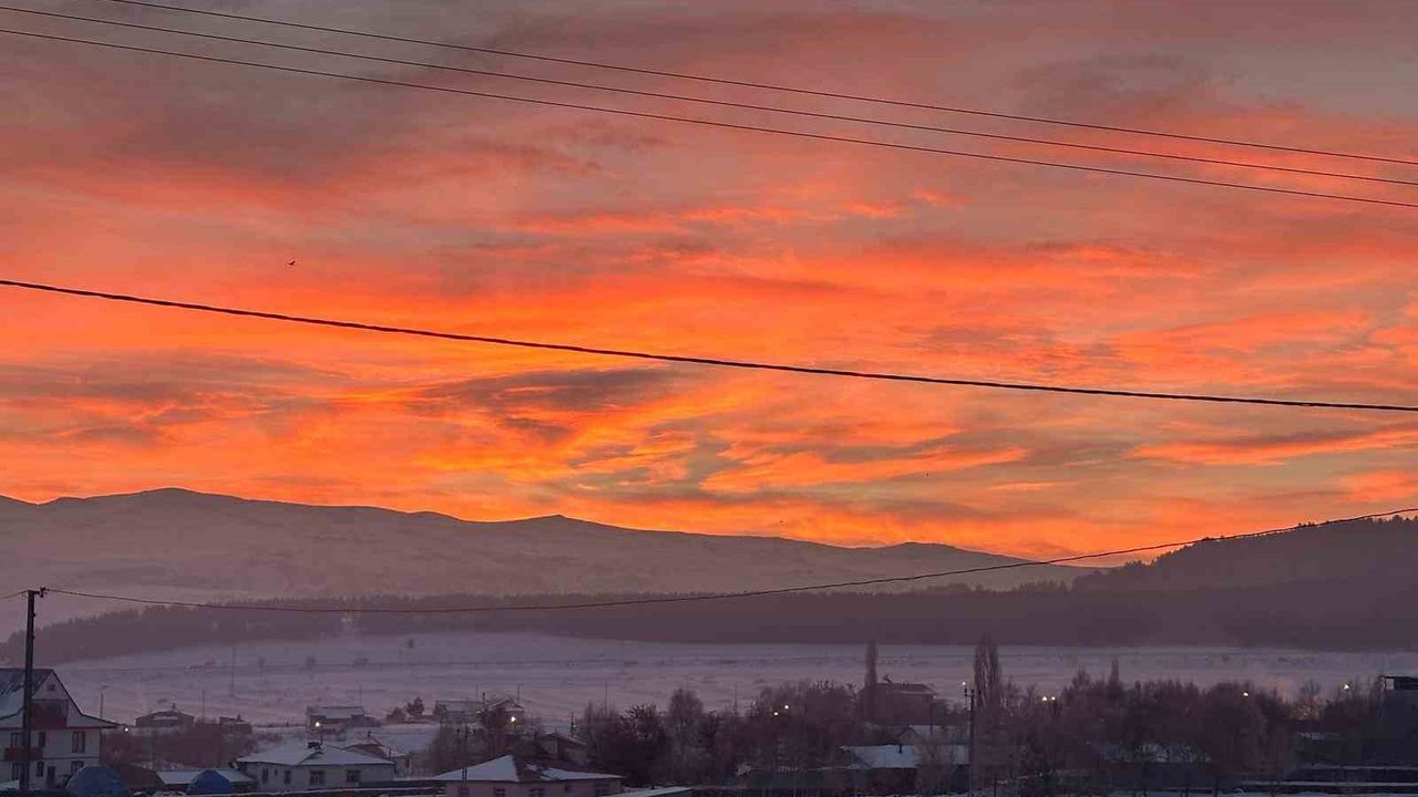 Ardahan'da gün doğumuyla kızıla bürünen gökyüzü görsel şölen oluşturdu.