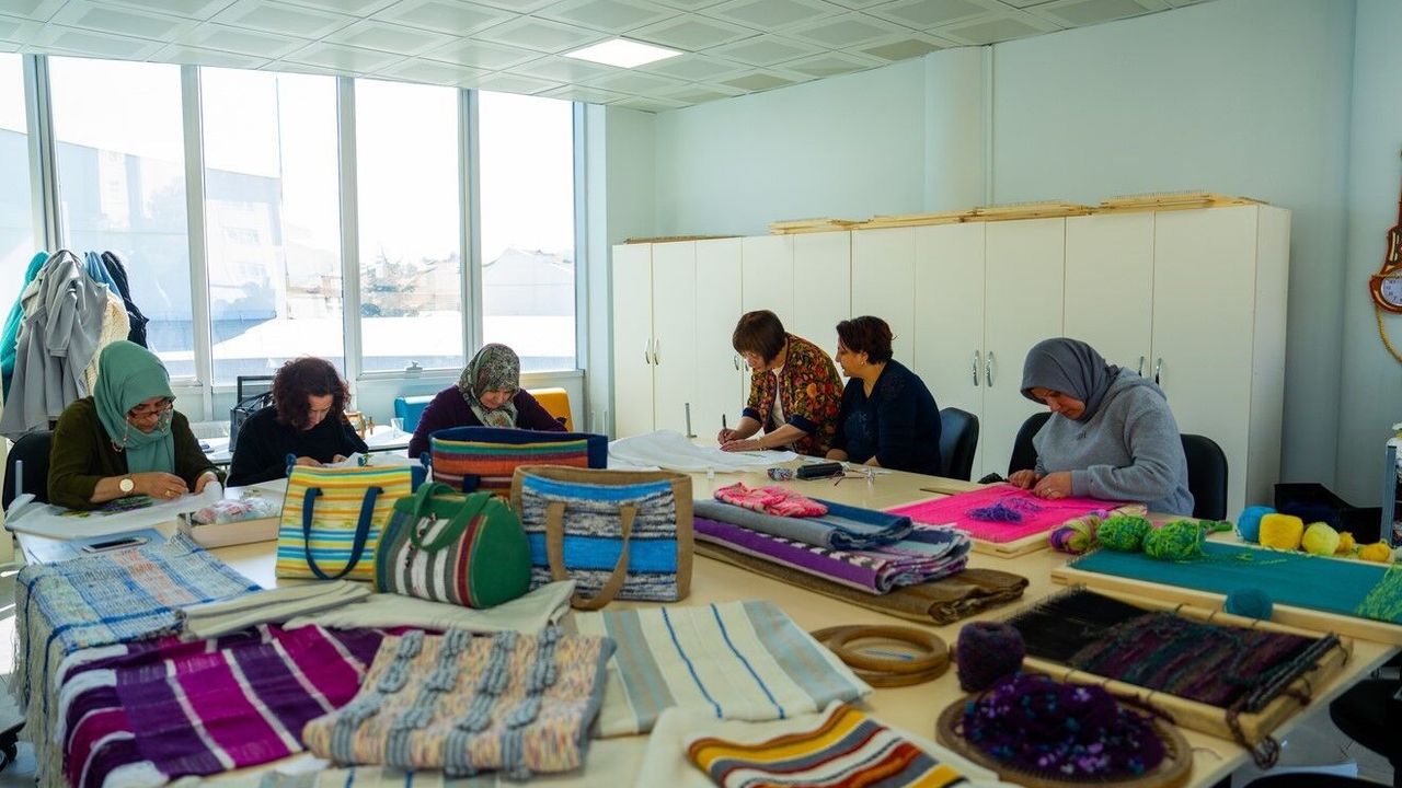 Gölbaşı Belediyesi Paylaşım Noktasına gelen atıl malzemeler Zübeyde Hanım Aile Yaşam Merkezindeki dokuma tezgahlarında kursiyerlerin emeğiyle yeniden hayat buluyor.
