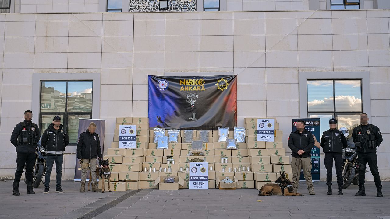 Yakalanan 5 farklı skunk türündeki uyuşturucu madde, Ankara Emniyet Müdürlüğünde basına sergilendi. İl Emniyet Müdürü Engin Dinç de görevli personeli tebrik etti.