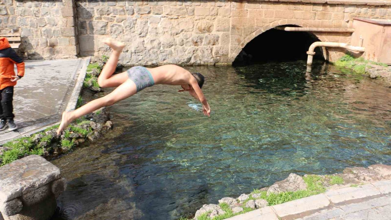 Diyarbakır'da etkili olan güneşli hava, özellikle çocuklar için beklenmedik bir eğlenceye dönüştü. Sur ilçesinde bulunan tarihi Anzele Parkı'nda bulunan süs havuzuna gelen çocuklar, soğuk havaya aldırış etmeden suda yüzdü. Hava sıcaklığının 7-8 derece civarında seyretmesine rağmen güneşi fırsata çeviren çocuklar, kış gününde yazı aratmayan görüntüler oluşturdu.
