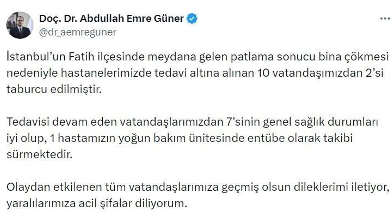 İstanbul İl Sağlık Müdürü Doç. Dr. Abdullah Emre Güner, Fatih'te çöken binada yaralananların durumu ile ilgili açıklama yaptı. Güner açıklamada, 'İstanbul'un Fatih ilçesinde meydana gelen patlama sonucu bina çökmesi nedeniyle hastanelerimizde tedavi altına alınan 10 vatandaşımızdan 2'si taburcu edilmiştir. Tedavisi devam eden vatandaşlarımızdan 7'sinin genel sağlık durumları iyi olup, 1 hastamızın yoğun bakım ünitesinde entübe olarak takibi sürmektedir. Olaydan etkilenen tüm vatandaşlarımıza geçmiş olsun dileklerimi iletiyor, yaralılarımıza acil şifalar diliyorum' ifadelerini kullandı.