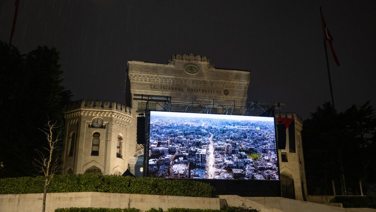 Üniversitenin Beyazıt'taki tarihi ana kapısı önünde bugün gerçekleştirilen etkinlik kapsamında, Filistin'de yaşananları anlatan LED ekran gösterimi yapıldı.