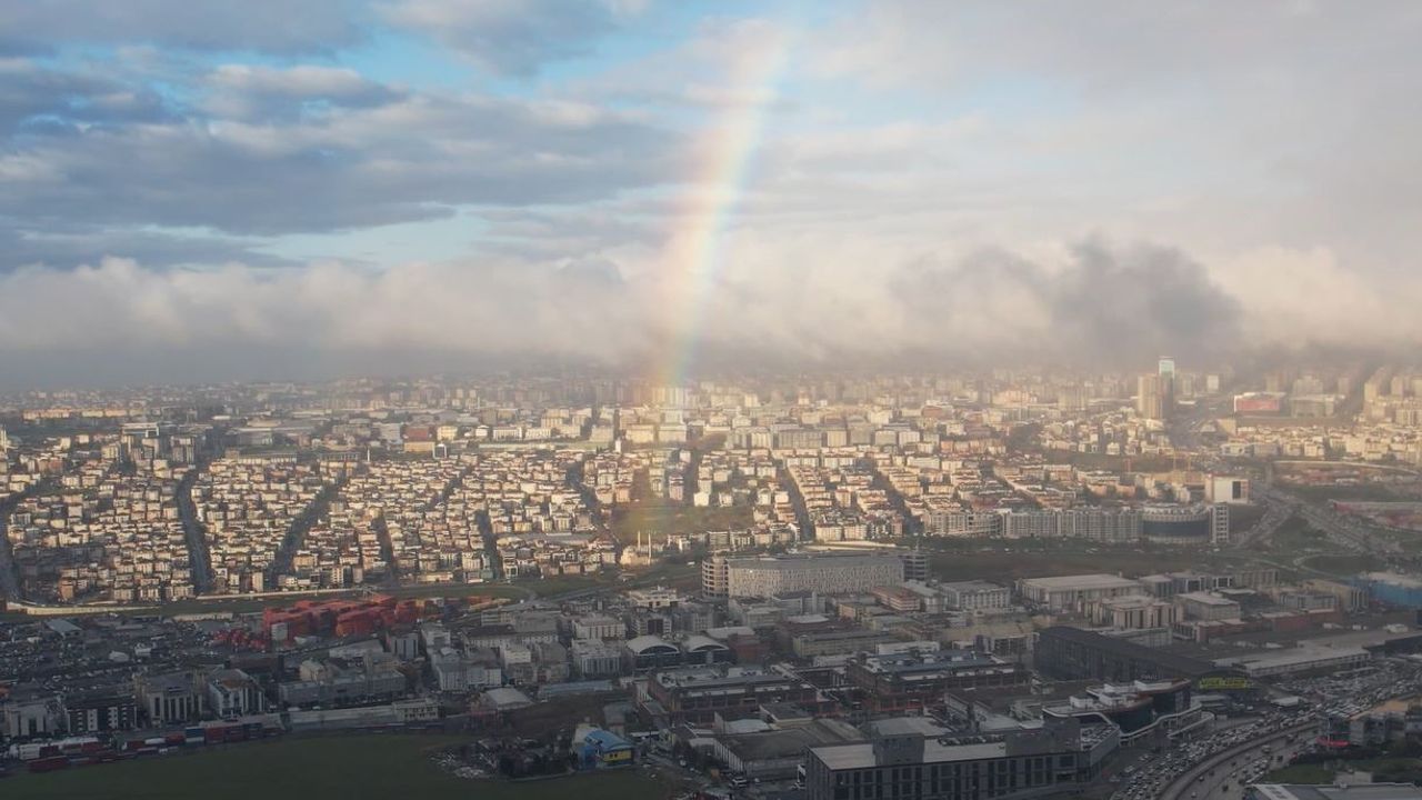 Kent genelinde etkili olan yağmur sonrası gökkuşağı sürprizi yaşandı. İstanbul Beylikdüzü ve çevresindeki gökkuşağı dron ile havadan görüntülendi.