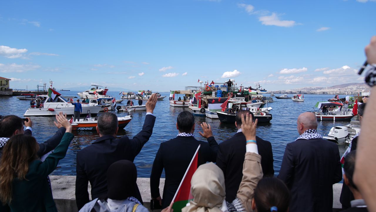 Filistin'e Destek Platformu tarafından organize edilen etkinlik kapsamında Bostanlı, Güzelbahçe, Sahilevleri, İnciraltı ve Mavişehir'deki balıkçı barınaklarından hareket eden tekneler Cumhuriyet Meydanı önünde buluştu.
