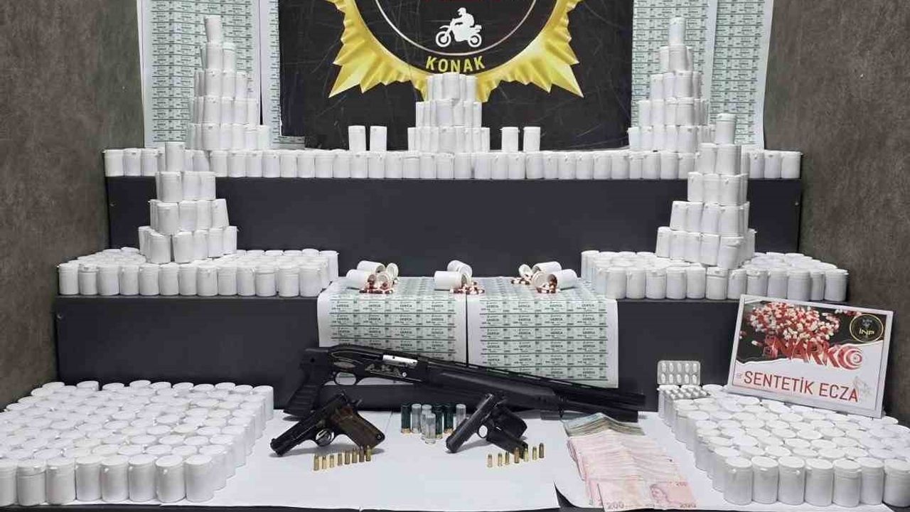 Edinilen bilgiye göre, İl Emniyet Müdürlüğü Konak İlçe Emniyet Müdürlüğüne bağlı Narkotik Suçlarla Mücadele (NARKO ALAN) ekipleri, uyuşturucu madde ticaretinin önlenmesine yönelik çalışmalarını sürdürüyor. Ekipler, 6 Ocak günü Hilal Mahallesi'nde uyuşturucu madde depolandığı ve ticaretinin yapıldığı belirlenen adreslere operasyon düzenledi. Adreslerde yapılan aramalarda 108 bin 472 adet sentetik ecza, 1 adet pompalı tüfek ve tüfeğe ait 9 adet dolu kartuş, 2 adet ruhsatsız tabanca, şarjörler ve çok sayıda fişek ile suçtan elde edildiği değerlendirilen 75 bin 100 TL nakit para ele geçirildi. Operasyonda N.P. (28), F.B. (29) ve N.K. (41) isimli 3 şüpheli yakalanarak gözaltına alındı. Yapılan sorgulamada şüphelilerden birinin kesinleşmiş hapis cezası ile arandığı tespit edildi. Şüpheliler hakkında adli işlem başlatıldığı öğrenildi.