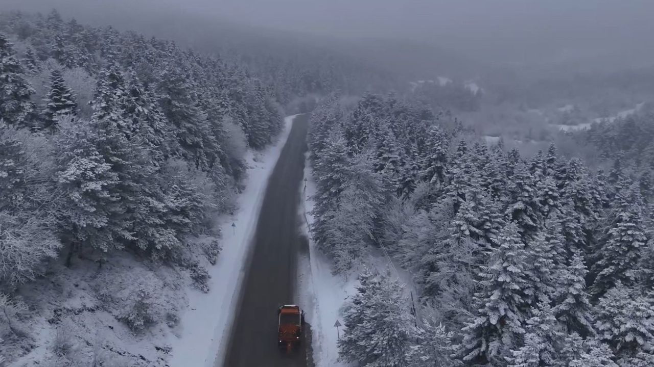 Kar yağışı ve sisin etkili olduğu bölgede oluşan manzara havadan görüntülenirken, Karayolları ekipleri de ulaşımda aksama yaşanmaması için kar küreme ve tuzlama çalışması gerçekleştirdi.