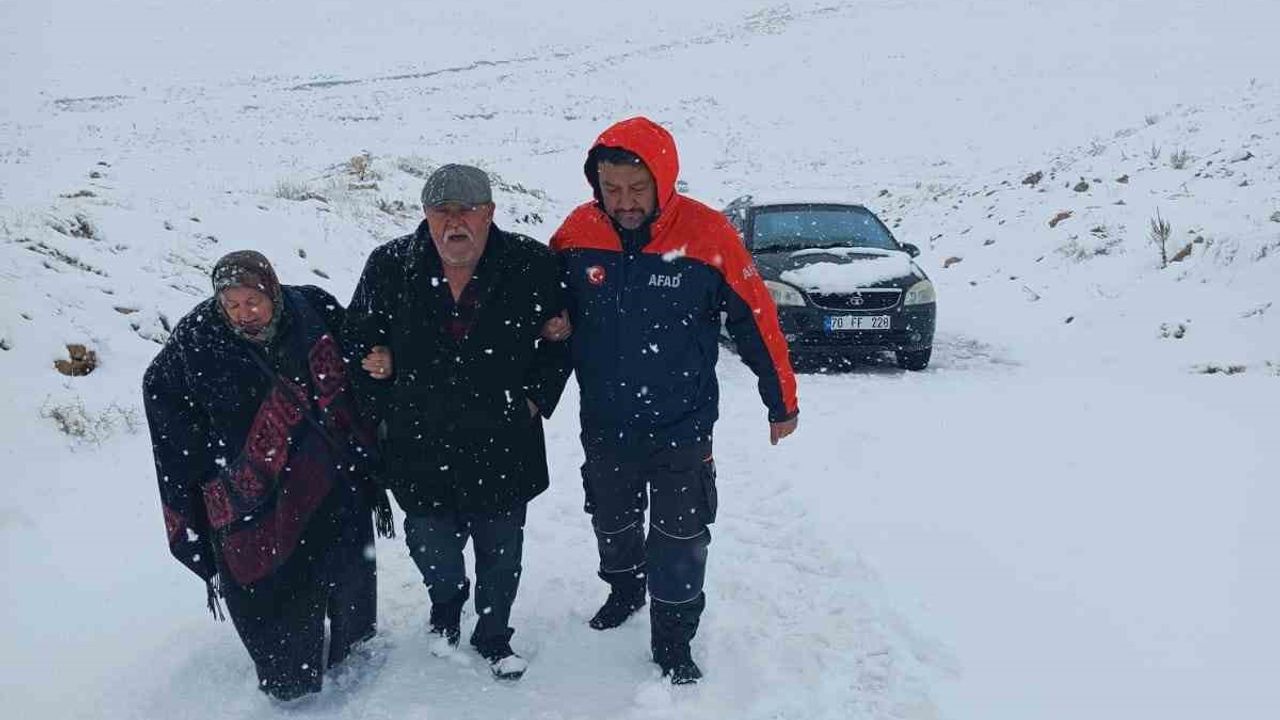 Karaman'da kar yağışı nedeniyle yolda mahsur kalan 4 kişi ekiplerin çalışmasıyla kurtarıldı.