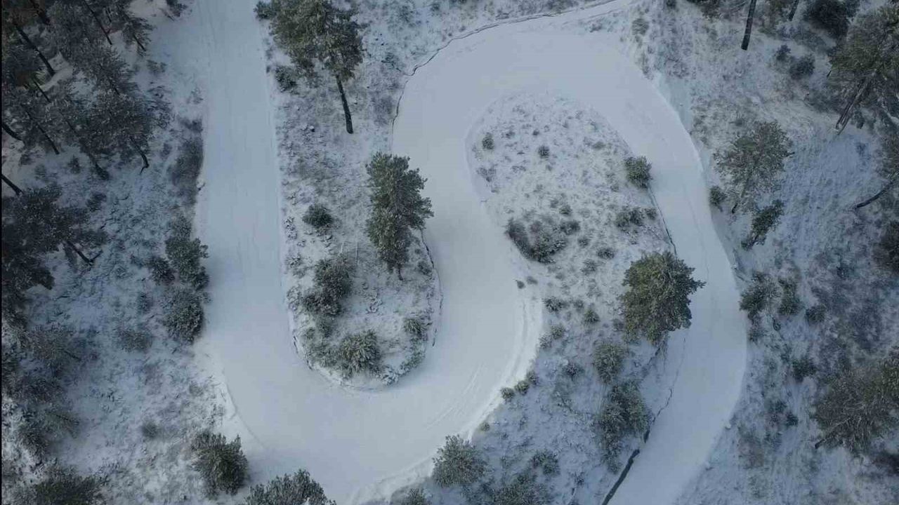 Drone ile kaydedilen görüntülerde, karla kaplanan dağ silsileleri, ormanlık alanlar ve kıvrılarak uzanan yollar görsel bir şölen sundu.