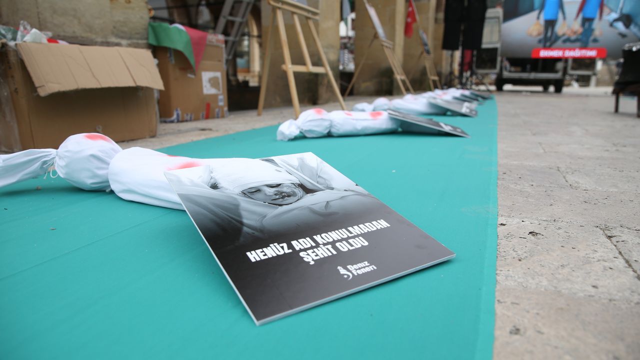 Nasrullah Meydanı'nda, Deniz Feneri Derneği ile Türkiye Gençlik Vakfı tarafından 'Gazze'ye Açılan Kapı' etkinliği kapsamında düzenlenen sergide, Gazze'de öldürülen ve açlıktan ölüme terk edilen çocukların fotoğrafları, simgesel kanlı bebek kefenleri ve boş kazanlar yer aldı.